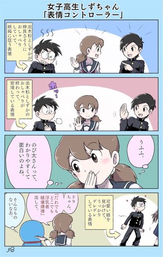 今日は四コマ漫画描きました お題箱から 「嫉妬させる小悪魔なしずちゃん」 お題に沿っているような、そうでもないような 女子高生しずちゃん系の漫画を描く時、 少なくとも一つは原作ネタを入れること ひとつはしずちゃんの可愛い表情を描くこと の二つを個…