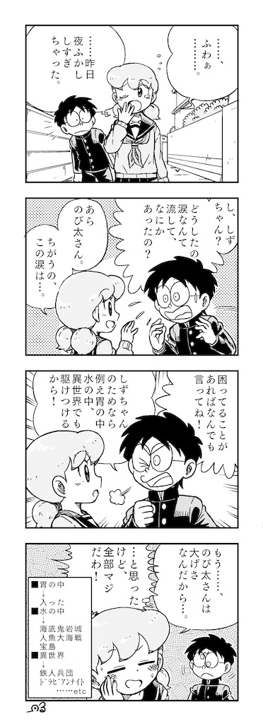 2022-11-24 【4コマ漫画】たとえ胃の中水の中【女子高生しずちゃん】 女子高生しずちゃんの4コマ漫画です たとえ胃の中水の中… のび太はしずちゃんのためなら身を粉にする覚悟でなんでもするイメージ 面倒くさがりなのに愛の力は偉大